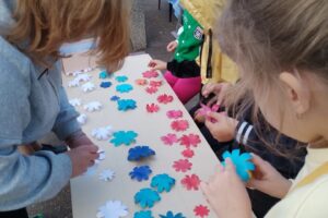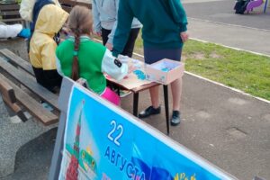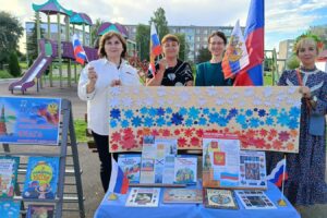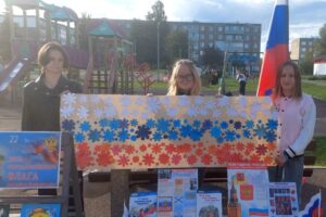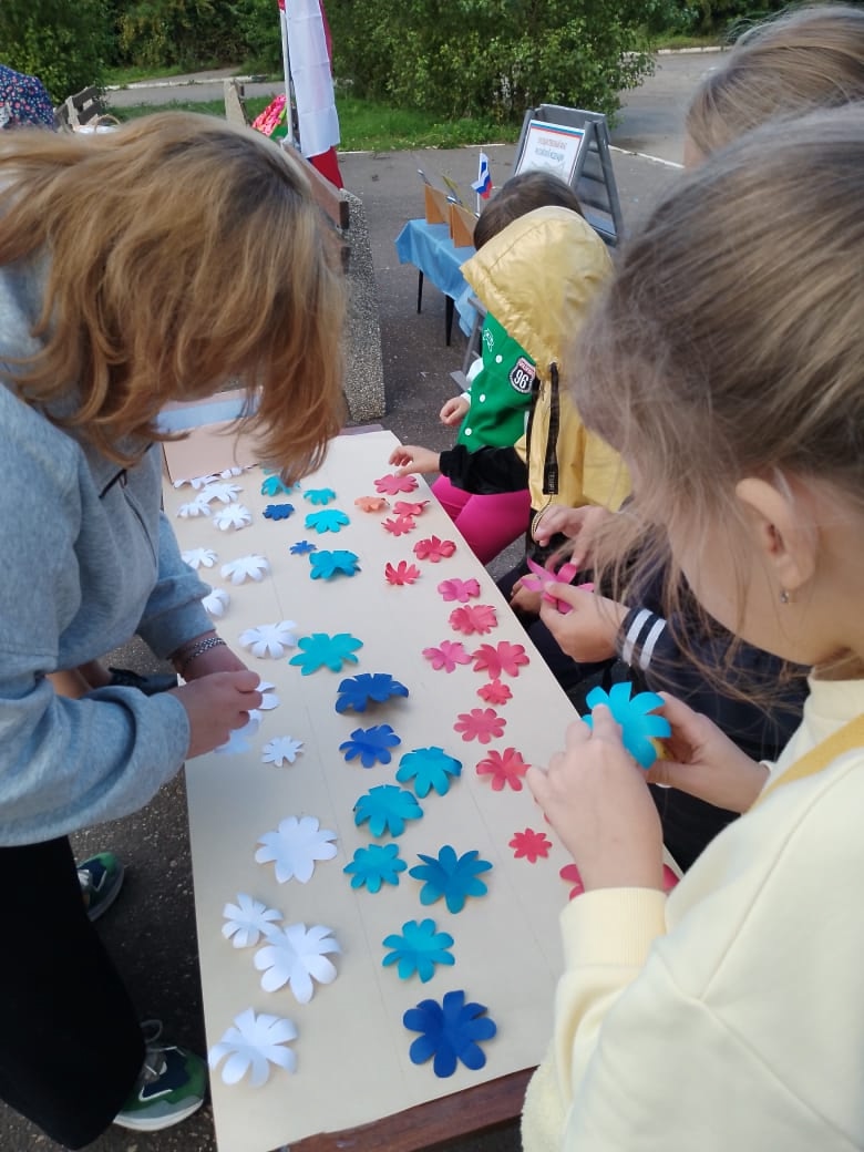 На площади прошла патриотическая акция «Три цвета российской славы», Из значимых цветов ребята создали на полотне российский триколор, символизирующий единство и патриотизм.