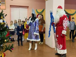 У красавицы Елки Дедушка Мороз и Снегурочка устроили для ребят танцевальную Снеготеку и завели шумный хоровод. Каждому участнику праздника главные волшебники Нового года вручили сладкие подарки.