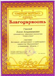 За активное участие в фестивале Елена Владимировна и Нина Дмитриевна были отмечены Благодарностью Управлением по культуре, молодежи и спорту администрации Рыбинского муниципального района.