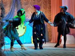 Баба Яга, Кикимора и Ворона украли минуты. Юные зрители пели, участвовали в танцевальном флеш-мобе, выполняли непростые задания, каверзы Бабы Яги, ловушки, расставленные Вороной и Кикиморой. Желающие приняли участие в фотосалоне «Новогодняя улыбка».